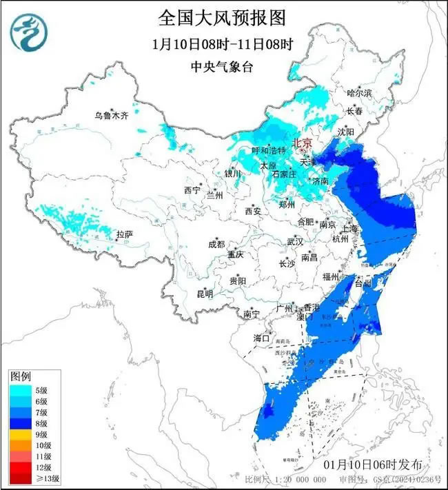 預計,1月10日08時至11日08時,西藏西部、甘肅北部、內(nèi)蒙古中東部、陜西北部、華北、山東、遼東半島等地部分地區(qū)有5~6級大風、陣風7~9級;渤海、渤海海峽、黃海大部海域、東海大部海域、臺灣海峽、臺灣以東洋面、巴士海峽、南海東北部和中部海域、南海西南部海域?qū)⒂?~8級、陣風9~10級的大風。