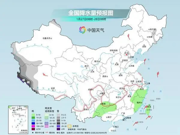 今明天(1月27日至28日),我國(guó)中東部地區(qū)降水日漸減少,西藏降雪將增多、增強(qiáng),局地或有特大暴雪,需注意防范。氣溫方面,未來(lái)幾天,我國(guó)大部氣溫多起伏,南方部分地區(qū)氣溫波動(dòng)明顯,公眾請(qǐng)適時(shí)調(diào)整著裝。