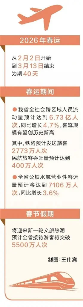 2026年春運從2月2日開始,到3月13日結(jié)束,為期40天。今年春節(jié)是個“大年”,共有9天假期,預(yù)計群眾返鄉(xiāng)、探親、旅游的出行意愿將更加強烈。春運期間,預(yù)計我省全社會跨區(qū)域人員流動量達到6.73億人次,同比增長4.7%,客流規(guī)模有望創(chuàng)歷史新高,其中鐵路預(yù)計發(fā)送旅客2773萬人次,民航旅客吞吐量預(yù)計達到400萬人次。