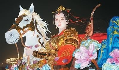 敘事主題的豐富,讓彩燈成為講述中國(guó)故事的載體。180米長(zhǎng)的《木蘭傳奇》燈組步道上,花木蘭的颯爽英姿與家國(guó)大義徐徐鋪展,傳統(tǒng)人物的精神內(nèi)核在現(xiàn)代光影技藝演繹下直抵人心。抬眼望去,全長(zhǎng)210米、高達(dá)32米的鯤鵬燈組震撼全場(chǎng),“鯤鵬展翅”的視覺奇觀與當(dāng)代載人航天、深潛等場(chǎng)景光影交融。福祿廣場(chǎng),藻井如蓮花般旋轉(zhuǎn),光影“福”字“從天而降”落入游客掌心,讓“伸手接福”從“吉祥話”變成可觸碰的溫暖記憶。