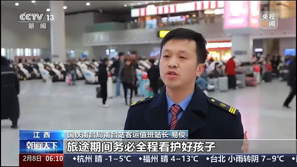 國鐵南昌局南昌站客運值班站長 易。郝猛酒陂g務(wù)必全程看護好孩子,切勿讓孩子脫離視線。如需幫助,可聯(lián)系車站工作人員和民警,謹防孩子走失、接觸陌生人員。