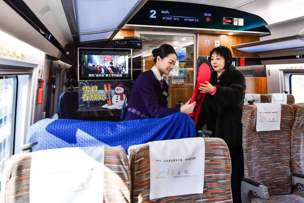 旅客可通過鐵路12306官方客戶端內的“雪具便利行”功能,查詢服務車次、辦理預約并支付相關費用后即完成辦理。辦理成功后,旅客可在乘車當日將妥善包裝的雪具帶至車站,經設有“雪具便利行”標識的通道進行安檢和驗票,車站工作人員將同步核驗車票與雪具運送預約信息。上車后,旅客可在列車工作人員引導下,將雪具放置于鄰近的“雪具存放區(qū)”。列車運行期間,工作人員將定時巡檢,共同保障雪具安全。