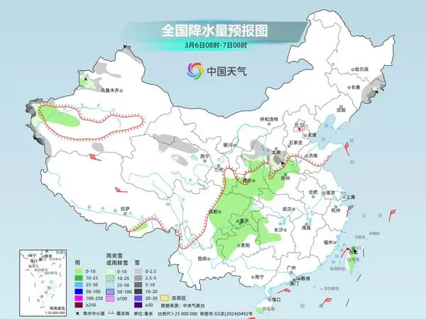 明天,黑龍江東南部、吉林東部、新疆西部和北部山區(qū)、青海北部、甘肅河西、陜西北部、山西中南部等地部分地區(qū)有小到中雪或雨夾雪,其中,吉林東部、新疆南疆西部山區(qū)、山西東南部等地局地有大到暴雪。