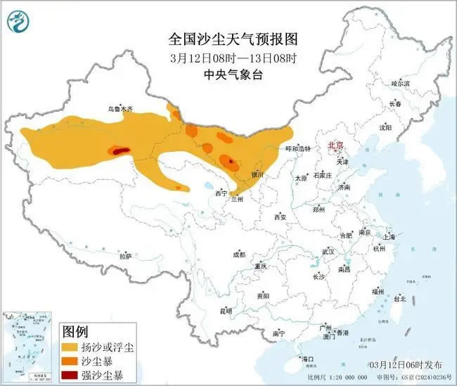 受大風天氣影響,預計3月12日08時至13日08時,新疆東部和南部、內(nèi)蒙古西部、甘肅西部、青海北部、寧夏中北部等地的部分地區(qū)有揚沙或浮塵天氣,其中,新疆南疆盆地東部、內(nèi)蒙古西部、甘肅西部局地有沙塵暴或強沙塵暴。