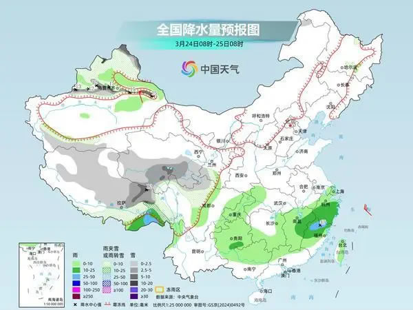 具體來看,中央氣象臺(tái)預(yù)計(jì),今天,新疆北疆北部和沿天山地區(qū)、西藏北部和東部、青海東部和南部、川西高原中北部等地部分地區(qū)有小到中雪或雨夾雪,其中,新疆北疆阿勒泰山區(qū)和沿天山地區(qū)、西藏東北部、青海東南部等地部分地區(qū)有大到暴雪。江漢西部、江南大部、西南地區(qū)東部、華南北部、臺(tái)灣島東部等地部分地區(qū)有小到中雨,其中,浙江南部、福建北部等地部分地區(qū)有大雨。