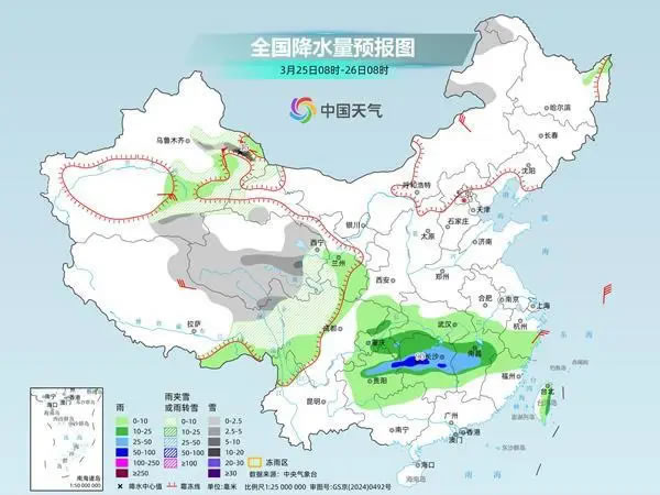 未來三天,南方大范圍陰雨天氣持續(xù),降水強(qiáng)度總體有所減弱,湖南、江西、福建等地部分地區(qū)有大雨或暴雨。此外,青藏高原、新疆部分地區(qū)今明天降雪將增多、增強(qiáng),部分地區(qū)有大到暴雪。