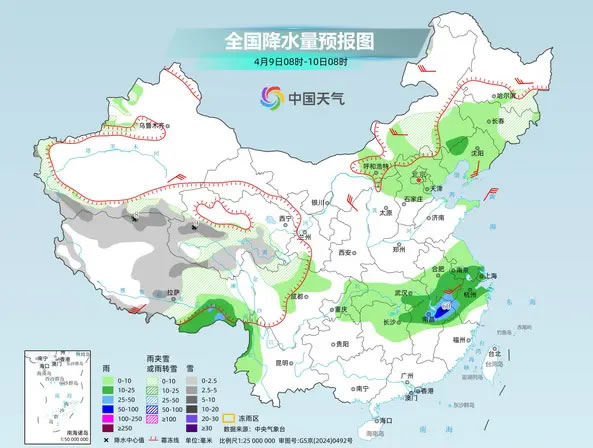 明天,新疆南疆盆地、西藏大部、青海南部和西部、川西高原北部、內(nèi)蒙古東部、黑龍江東南部、吉林東部等地部分地區(qū)有小到中雪或雨夾雪,其中,西藏北部、青海西部等地部分地區(qū)有大雪;西藏東南部、湖北東南部、蘇皖南部、上海、浙江北部、江西北部等地部分地區(qū)有中到大雨,其中,江西北部等地部分地區(qū)有暴雨。