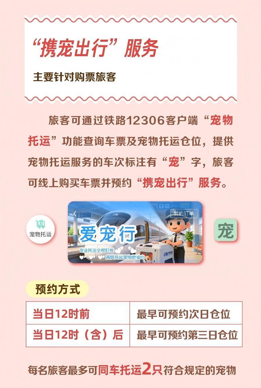 其中,“攜寵出行”服務主要針對購票旅客,旅客可通過鐵路12306客戶端“寵物托運”功能查詢車票及寵物托運倉位,提供寵物托運服務的車次標注有“寵”字,旅客可線上購買車票并預約同車寵物托運服務,每日12時前最早可預約次日倉位,12時(含)后最早可預約第三日倉位,每名旅客最多可同車托運2只符合規(guī)定的寵物。