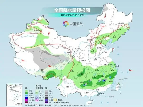 后天,內(nèi)蒙古東北部、黑龍江西北部、新疆北疆北部、西藏東南部、青海北部、甘肅河西、川西高原等地部分地區(qū)有小雪或雨夾雪,其中,內(nèi)蒙古東北部、黑龍江西北部、新疆北疆北部等地部分地區(qū)有中到大雪;陜西北部、山西西部、江南中南部、西南地區(qū)東部、華南北部等地部分地區(qū)有中到大雨,其中,湖南中部、江西中部、福建西北部、貴州東南部、廣西東北部等地部分地區(qū)有暴雨或大暴雨。
