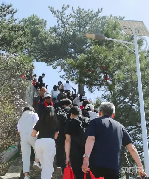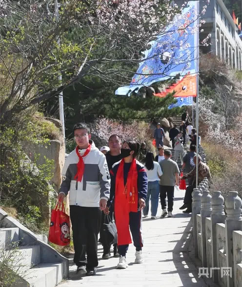 沿著青石步道拾級(jí)而上,步步皆景、處處入畫。花枝隨風(fēng)輕舒,花瓣簌簌飄落,鋪就一條條浪漫花徑;林間鳥鳴清脆,與游客歡聲笑語交織,匯成動(dòng)聽的春日交響曲;山間云影流轉(zhuǎn),陽光透過花枝灑下斑駁光影,一步一景皆藏詩意。游客們或漫步花海深呼吸,沉醉自然野趣;或舉手機(jī)相機(jī)駐足打卡,定格春日盛景;或結(jié)伴邊走邊聊,賞雄奇風(fēng)光、品道教文化,盡享踏青愜意。