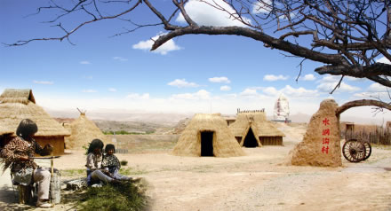 古老的水洞溝村是由北方的先民們創(chuàng)造了窖洞式和地穴式的居室方式。這種居室往往是建在黃土層較厚的山坡或溝岸上,具有冬暖夏涼的特點。水洞溝人在此基礎上改進了這種居住方式,發(fā)展成一種半地穴式建筑形式。其方法是在黃土坡上先挖出一定深度的地穴,然后在地穴四壁確定為墻壁的地基上,用土坯(pī)壘墻,使之達到一定高度,再以桁(xíng)條,木椽搭頂,復以柴草,柴草上面糊以泥土,防止漏水。水洞溝村就是這樣一個古老的半地穴式的聚集村落遺址,我國西北地區(qū)群眾習稱其為“地窩子”。水洞溝村聚落共有29處地穴式建筑遺址,我們選擇了其中的一些進行了恢復,讓我們能夠直觀地了解先民們的居住形式。