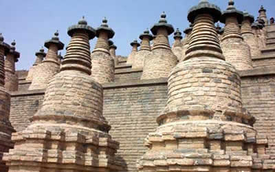 一百零八塔是中國現(xiàn)存的大型古塔群之一,位于銀川市南60公里的青銅峽水庫西岸崖壁下,塔群坐西面東,依山臨水,塔基下曾出土西夏文題記的帛書和佛禎,可能建于西夏時(shí)期是喇嘛式實(shí)心塔群。佛塔依山勢自上而下,按1、3、3、5、5、7、9、11、13、15、17、19的奇數(shù)排列成十二行,總計(jì)一百零八座,形成總體平面呈三角形的巨大塔群,因塔數(shù)而得名。