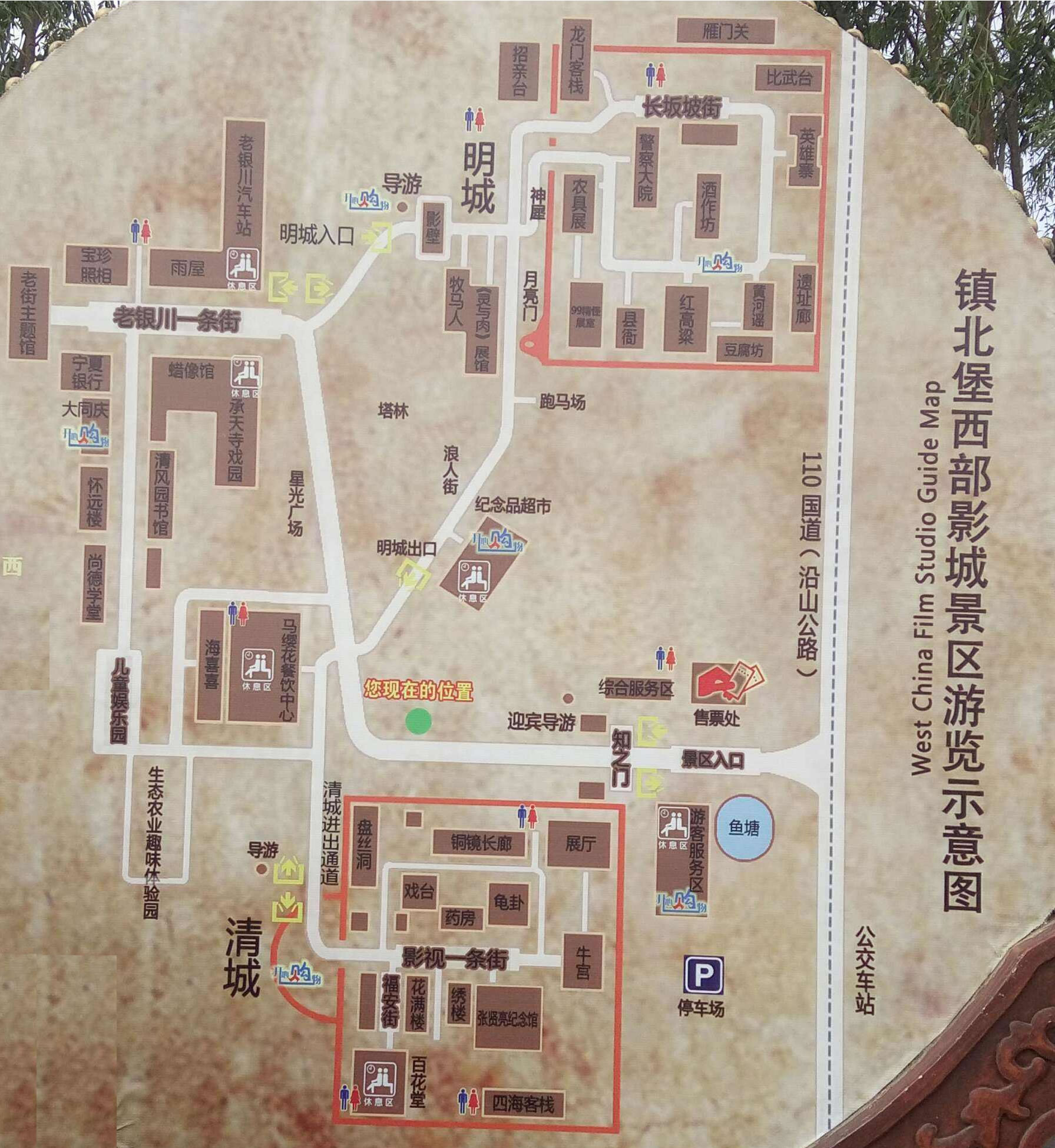 鎮(zhèn)北堡西部影城,位于寧夏回族自治區(qū)銀川市西夏區(qū)北端,占地面積0.7平方公里,建筑面積50萬平方米。鎮(zhèn)北堡西部影城有兩座古代城堡,兩堡一南一北,名為鎮(zhèn)北堡和鎮(zhèn)南堡,均坐西朝東。鎮(zhèn)北堡西部影城以古樸原始粗獷荒涼民間化為特色。鎮(zhèn)北堡西部影城內(nèi),保留和復(fù)原了拍攝過部分影片的場景和道具,供游人觀賞。展出的場景有《大話西游》中的城門樓和城門洞盤絲洞,孫悟空與牛魔王打斗時的“天崩地裂”等一系列場景!饵S河謠》中的“鐵匠營”實景!都t高粱》中的月亮門、釀酒作坊、九兒(鞏俐飾)居室和九兒出嫁時乘坐的轎子、盛酒的大缸碗具等。還建有電影資料館放映廳等影視服務(wù)設(shè)施。