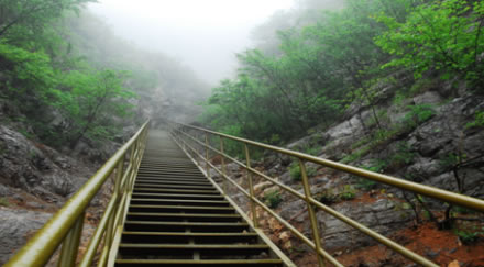 位于旅游南線,從下到上,一共有488級階梯,上下直線距離近兩百米,是連接南線進入景區(qū)絕佳景觀的必經(jīng)之路,直上直下,有“平步青云”的寓意。