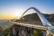 玻璃橋為無背索斜拉弧形玻璃橋,建于潭溪山海拔700米的崖壁之上,橋面跨度117米,懸空高度101米,外弧最大半徑90米,總承載可達900噸,單次承載10000人。玻璃橋整體由百米觀光電梯、懸崖酒店及玻璃橋體組成。其中,百米觀光電梯采用全景玻璃設(shè)計,依懸崖而建,集觀光、代步、游覽為一體。橋體的彩虹狀獨特造型,充滿動感與美感,且與山崖風(fēng)格渾然一體。潭溪山高空玻璃橋迄今為止,潭溪山高空玻璃橋已獲得兩項國際大獎:2019年世界結(jié)構(gòu)大獎——行人橋梁獎,2020年國際橋梁大會(IBC)——亞瑟·海頓獎。