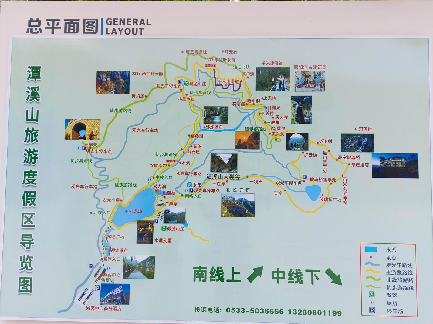 旅游中線:全程約1小時,以農(nóng)家風(fēng)光、休閑娛樂為特色,主要景點有:潭溪山大瀑布、如意廣場、九龍?zhí)、潭溪山莊、自醉亭、潛龍洞、逍遙橋、潭溪山古酒坊、農(nóng)家田園、后哨石屋、櫻桃峪、神龜探路、姊妹瀑布、兒童撒野樂園、乘觀光車下山。 |