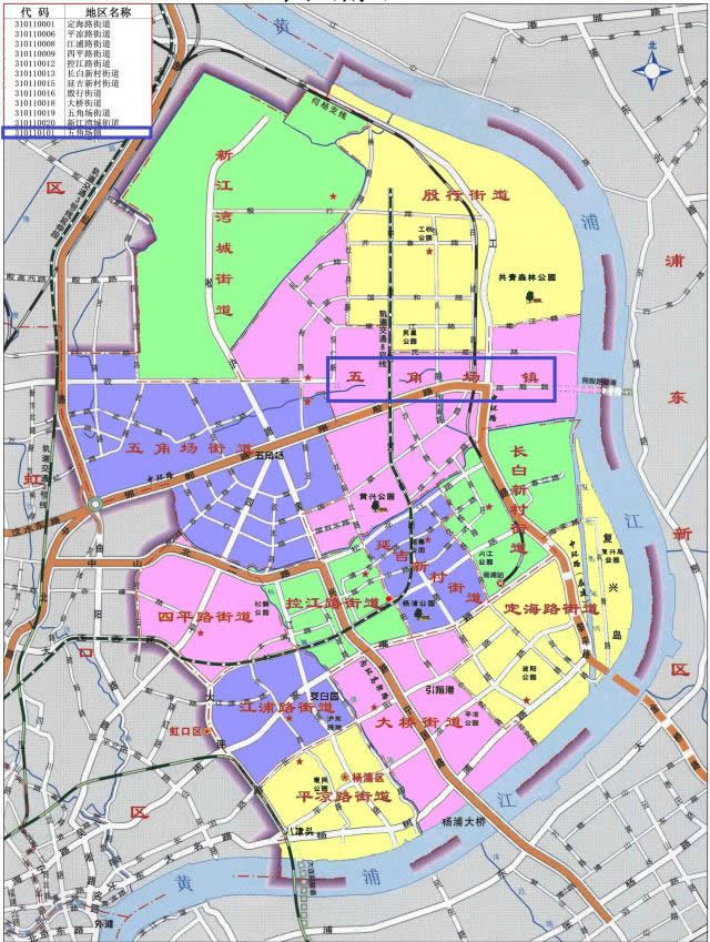 楊浦區(qū)轄12個(gè)街道:定海路街道、平?jīng)雎方值馈⒔致方值、四平路街道、控江路街道、長(zhǎng)白新村街道、延吉新村街道、殷行街道、大橋街道、五角場(chǎng)街道、新江灣城街道、長(zhǎng)海路街道