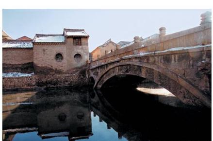 景德橋,俗稱西關(guān)大橋,中國(guó)著名古橋之一,橫跨在山西晉城市城區(qū)白水河上,連貫兩岸公路,因通沁水、陽(yáng)城一帶,一度稱沁陽(yáng)橋。創(chuàng)建于金大定二十九年(1189年)。清乾隆四十八年(1783年)改今名。橋用二十五道立券石并排砌成,橋面長(zhǎng)30米,券高3.7米,跨度16米,券寬6米,兩端各負(fù)一券,以分剪洪水沖擊面,減輕大橋的荷重力。橋面兩側(cè)石雕獸面、海馬、行龍、海水等紋圖案,券門上雕螭首,均精巧。