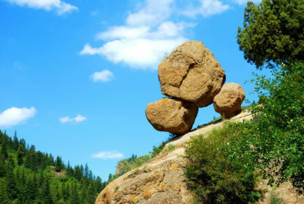 寧武縣城30公里處的東寨鎮(zhèn)西樓子山南麓半坡,有一座峭巖矗立于溝側(cè)溪畔。這峭巖高約兩丈余,頂部巍巍托起一塊巨大奇石。這奇石以兩塊小石作支腳,立于約三四十度的峭巖斜坡頂部。奇石高約3米,闊約2米。雖立斜坡,風(fēng)吹似動,但數(shù)干百年來,它卻一直屹立在那里。由于奇石狀似加蓋的鍋,支撐它的兩小石形若鍋腳,故而人稱“支鍋奇石”,成為古寧武府和寧武縣八大奇景之一。據(jù)關(guān)專家考察,該奇石形成于第四紀(jì)冰川期。