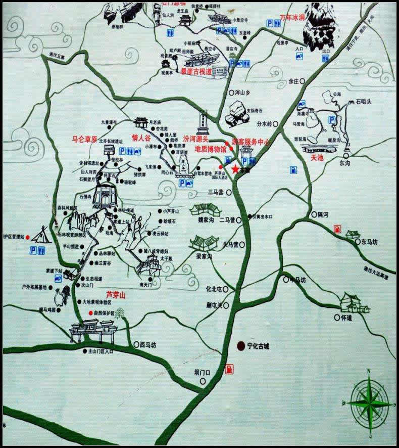 景區(qū)以蘆芽山(太子殿主峰)為中心,包括馬侖草原、小蘆芽山、萬年冰洞、千年地火以及懸崖棧道、天池湖群和情人谷等諸多景點。