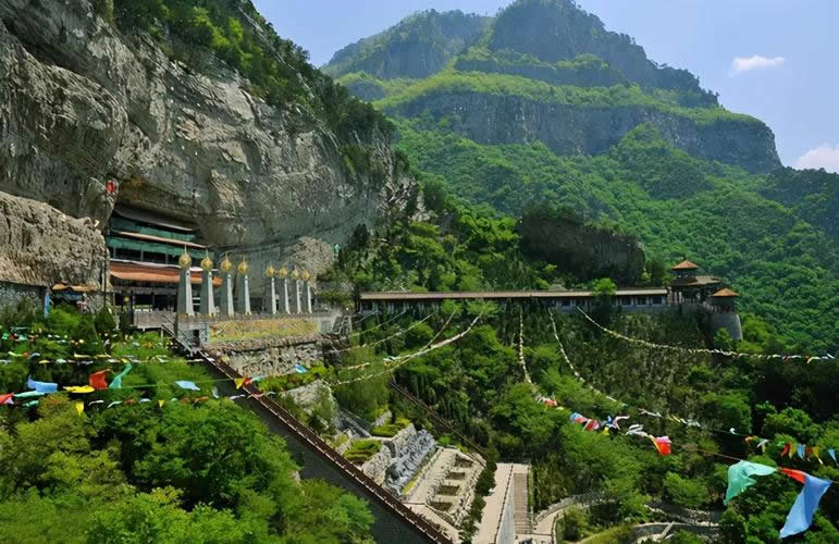 天橋是因修筑在懸崖絕壁上的棧道而得名,有千余年的歷史。長(zhǎng)300余米,寬 1 米多,上離峰頂80余米,高入云表;下距溝底300余米,懸于危巖上。每逢雨過(guò)云涌,人在橋上過(guò),云在腳下飛,使人有平步青云,飄飄欲仙之感。景區(qū)內(nèi)主要建筑是洞神宮、祖師殿、七真殿、水母殿、懸空長(zhǎng)廊等和回頭看柏龍、兔橋、須彌石等名勝景觀。有孔明和張良等人的修行洞。此外還有中國(guó)古代最險(xiǎn)絕的軍事堡壘——石勒寨,地勢(shì)險(xiǎn)峻,易守難攻。