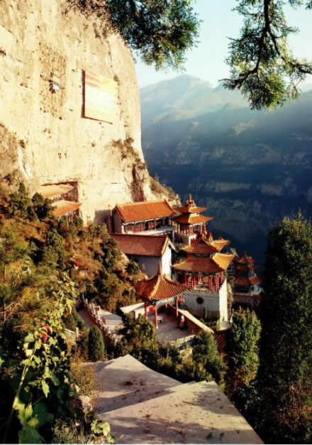 2、抱腹巖的山勢(shì)奇特為天下"絕無(wú)僅有"。它高60米,寬180米,深50米。可以抱二百余間殿宇館舍及一兩萬(wàn)名游人于其中。驚險(xiǎn)壯觀的巖下飛空掛鈴,更為一絕。