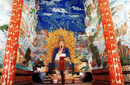 6、大羅宮是一座依山而建的明四暗七仿古建筑,總面積達(dá)30000平方米,堪與布達(dá)拉宮媲美,為天下第一道宮。宮內(nèi)300平方米中國(guó)百位名家題寫的《道德經(jīng)》木刻,以及300平方米的布畫都是中國(guó)一絕。