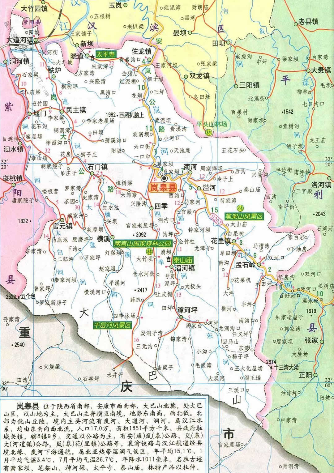 境內(nèi)交通便捷,資源豐富。全縣四級以上公路總里程268.8公里,其中207省道貫穿6個鄉(xiāng)鎮(zhèn),98%的村修通 了村級公路,嵐城、大洞等公路的貫通,形成了東通平利、西到紫陽、北連安康、西接重慶的公路交通網(wǎng)絡(luò)。航運蓬勃發(fā)展,建永久性碼頭2個,營運航運里程114公里。
