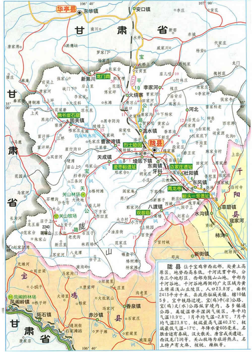 隴縣行政隸屬陜西省寶雞市,地處渭北高原西部邊緣地區(qū)(關(guān)山東麓),位于東經(jīng)106°26′32″~107°8′11″,北緯34°35′17″~35°6′45″,東連千陽縣,南鄰寶雞縣,西北與甘肅省的清水、張家川、華亭、崇信等縣接壤,南北寬57.6公里,東西長59.7公里,境內(nèi)川原狹小,山大溝深,地勢險(xiǎn)要,是關(guān)中通往西北的主要關(guān)隘之一,是古代兵家必爭之地,古有“關(guān)狹鑰匙”。