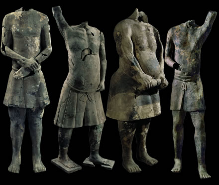 此套展品為秦代的陶器,出土于秦始皇帝陵K9901陪葬坑。一號(hào)百戲俑,殘高152.00厘米,右臂有刻劃文字“咸陽(yáng)親”。三號(hào)百戲俑,殘高172.00厘米。四號(hào)百戲俑,殘高152.00厘米。十九號(hào)百戲俑,殘高181.00厘米。1999年,考古人員在秦陵?yáng)|南部?jī)?nèi)外城垣之間的陪葬坑內(nèi),試掘出土了陶俑11件,它們上體裸露,下體著裳。動(dòng)作有直立狀、雙手卷衣?tīng)、一手叉腰一手高舉、雙腿弓箭步、半跪狀等。