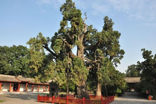 黃帝腳印石旁,有一棵漢武掛甲柏,又稱將軍柏,志載:“漢武帝征朔方還,掛甲于此樹(shù)!睒(shù)干斑痕密布,縱橫成行,似有斷釘在內(nèi),是群柏之中最為奇特的一株。特別是每年清明節(jié)前,這棵古柏枝干上流出的柏液凝結(jié)為球狀,經(jīng)陽(yáng)光反射尤為壯觀,吸引著各地前來(lái)謁陵拜祖的人。然而清明節(jié)一過(guò),柏液中斷,古柏從枝到桿又恢復(fù)了原來(lái)密密麻麻的甲痕。