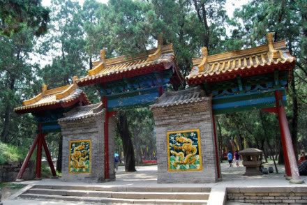 神道盡頭便是陵區(qū)。陵園四周順依山勢(shì),修有綿亙不絕的青磚圍墻,高1.6米,涂以紅色,象征至尊至偉。墻頭為紅椽綠瓦,古色古香。整個(gè)陵園,南北約210米,東西約72米。
