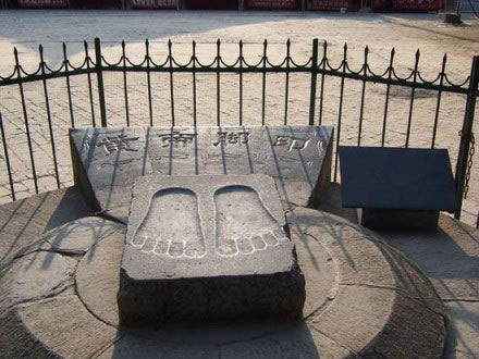 整塊石頭約一平方米。青石面上,鐫刻有黃帝腳印一雙。民間有向黃帝腳印投硬幣或零錢以測(cè)運(yùn)氣的習(xí)俗,據(jù)說(shuō)投向腳印大拇趾運(yùn)氣最好,為大吉大利。