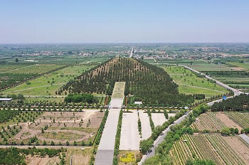 上述與今測量數(shù)字基本相符。總占地面積計(jì)為56878.25平方米,封土體積848592.92立方米。陵園四周呈方形,平頂,上小下大,形如覆斗,顯得莊嚴(yán)穩(wěn)重。