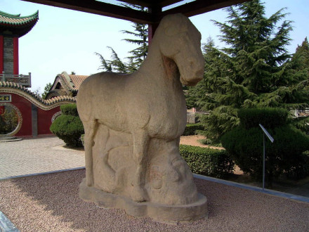 1981年5月在平陽公主墓南,西吳鄉(xiāng)竇馬村農(nóng)民在平整土地時(shí)發(fā)現(xiàn)這件文物。高62厘米,長76厘米,通體銅鑄鎏金,昂首,翹尾,四腿直立,體態(tài)矯健。頭部造型甚為生動,粉鼻亮眼,兩耳豎立。史書記載其為“金馬”,系以西漢時(shí)大宛國的汗血馬為原型而精制的工藝品。這件國寶,現(xiàn)收藏在茂陵博物館。
