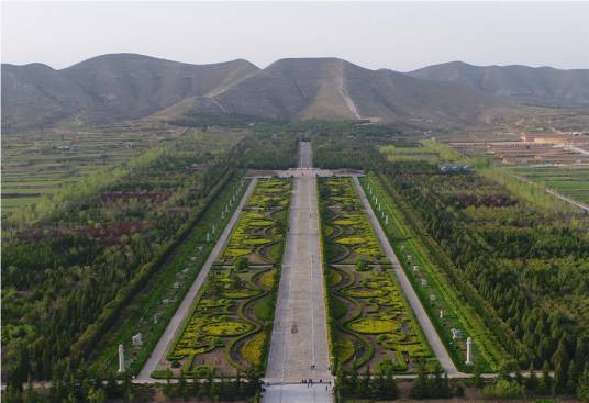 橋陵陵園略呈長(zhǎng)方形,東西長(zhǎng)2871米,南北長(zhǎng)2836米,總面積852萬平方米。四面開辟有門,四角有樓。歷經(jīng)千年風(fēng)蝕雨剝,唐橋陵所保留的石華表、石鴕鳥、石馬、石人、石獨(dú)角獸、石獅等五十余尊巨大石刻依然形態(tài)清晰,生動(dòng)自然,其中的38尊排列在寬達(dá)110米、長(zhǎng)625米的神道兩旁。
