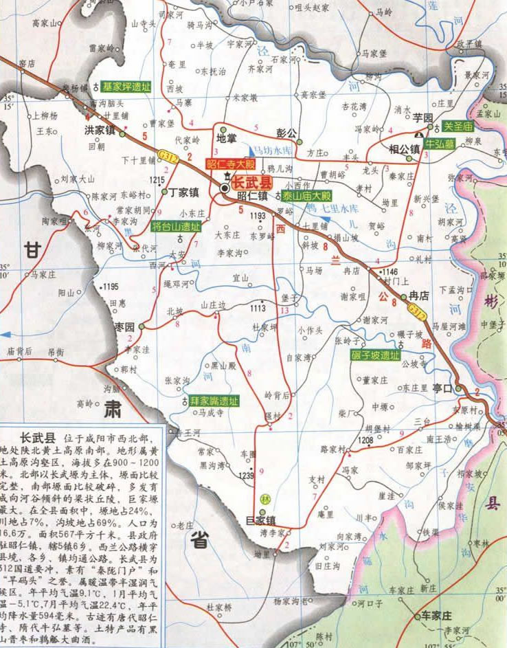 長武歷史悠久,風(fēng)景秀麗,四季分明,物產(chǎn)豐富,人杰地靈。312國道橫貫全境,鄉(xiāng)村公路交織,交通十分便利。全縣有文物景點225處,其中國家和省級重點文物保護單位8處。 大唐昭仁寺內(nèi)初唐所建的純木結(jié)構(gòu)大雄殿和唐初四大書法家之一虞世南所書“大唐豳州昭仁寺碑”,譽為全國之最。長武境內(nèi)的文物古跡品位之高,數(shù)量之多,規(guī)模之大,館藏文物之精,種類之全,在縣區(qū)一級實不多見。長武文化積淀深厚,名勝古跡,人文景觀,遍布城鄉(xiāng)。公劉居長 “教民稼穡”。隋相牛弘,長武人氏。地方小吃,做工精細,風(fēng)味獨特,盛名不虛。傳統(tǒng)文化,民間藝術(shù)豐富多彩,社火、剪紙、皮影、膳鼓獨具特色。以田園風(fēng)光為特色的馬坊自然風(fēng)景區(qū),王東、柳樹咀萬畝蘋果園、紅地球葡萄園頗具影響。生態(tài)農(nóng)業(yè)、文物古跡、自然景觀等呈現(xiàn)出前所未有的興旺景象。