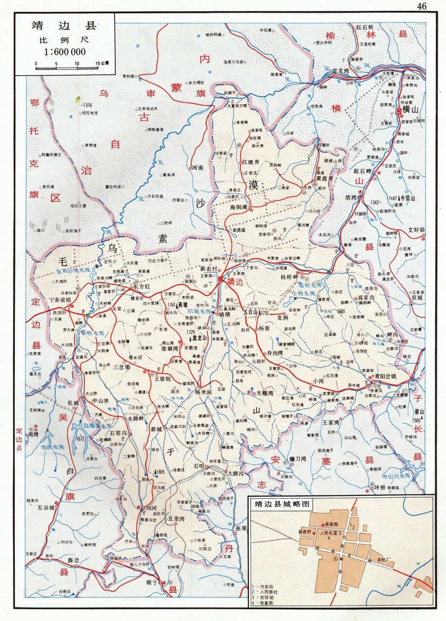 置縣初縣域無考。清乾隆年間(1736~1795),新城堡為縣城:“東與懷遠(yuǎn)縣清平堡接壤,一百二十里;西與定邊縣柳樹澗接壤,一百二十里;南與保安縣牛頭坡接壤,一百一十里;北至邊墻十里”(乾隆手抄本《靖邊縣志稿》)。光緒年間(1875~1908),鎮(zhèn)靖堡為縣城:“東至崔家畔一百里,與懷遠(yuǎn)縣之狄青原接界;西至二道渠一百一十里,與定邊縣之茶店圾接界;南至黃花池灘二百一十里,與保安縣之柳溝接界;北門外即邊墻,出口至四樸樹六十里,與懷遠(yuǎn)縣之本塔兒梁接界;東南至沈家園子八十里,與安塞縣之平橋接界;西南至闊闊川二百一十里,與定邊縣之侯家岔、甘肅省安化縣之亂石頭接界;東北至毛烏素六十里,與懷遠(yuǎn)縣之許家沙畔接界;西北至史家地坑一百一十里,與定邊縣之二十里塘接界。計東西廣二百一十里,南北袤二百七十里”(光緒本《靖邊縣志》)。