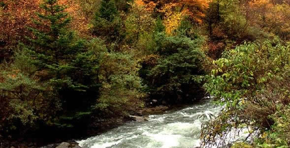 奶子溝:在藏語中是美麗富饒、幸福安寧之意。奶子溝八十里彩林風情谷因身處深谷獨享清幽雅靜的奶子溝而得名,又以美甲天下的彩林世界而聞名。這里植被豐茂,陽光燦爛,氧氣充足,是個天然的大“氧吧”。奶子溝彩林洋洋灑灑長達八十里,蔚為壯觀。樹種主要由樺樹、松樹、柏樹、楓樹和各種喬木組成,還有不同色彩的針葉林、闊葉林、次生林、灌木叢點綴其間,密密麻麻地覆蓋了一坡又一坡。在純凈的藍天底下,紫紅、粉紅、橘紅、金紅、深黃、草綠、黃綠、棕紅、褐色的樹木形成了“萬類霜天競自由”之勢。進入彩林世界你會感覺進了油彩的世界,任你語言學(xué)家、色彩學(xué)家在它面前都會感到詞匯的匱乏,色彩的蒼白。