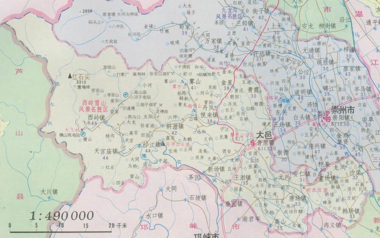 鎮(zhèn):晉原鎮(zhèn)、王泗鎮(zhèn)、出江鎮(zhèn)、西嶺鎮(zhèn)、斜源鎮(zhèn)、董場(chǎng)鎮(zhèn)、韓場(chǎng)鎮(zhèn)、三岔鎮(zhèn)、上安鎮(zhèn)、蘇家鎮(zhèn)、新場(chǎng)鎮(zhèn)、安仁鎮(zhèn)、悅來鎮(zhèn)、青霞鎮(zhèn)、沙渠鎮(zhèn)、蔡場(chǎng)鎮(zhèn)、花水灣鎮(zhèn)