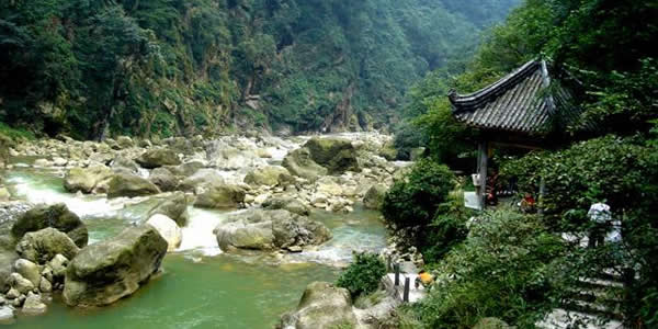 九龍溝:位于崇州市西北三郎鎮(zhèn),因“九溝九槽九條龍”的神話傳說而得名。這一地區(qū)為龍門山脈口段前斷裂帶,地質(zhì)構(gòu)造復雜,群山在海拔700米到3868米之間起伏變化,相對高差懸殊較大,懸崖陡峭,多飛瀑迭湍、深溝狹谷,有眾多的酷似龍形的奇峰怪石和飛瀑流泉。九龍溝內(nèi)水石相擊之聲如龍吟似龍嘯,巨石躺臥之狀如龍盤似龍睡,山峰聳立之形如龍騰似龍臥,簡直就是活生生的“人間龍宮”。崇州百姓中流傳有“九條龍從九龍池出游,在九龍山會合,回九龍溝安家,并在龍?zhí)蚴狭粝戮艤暇挪劬艞l龍”的神奇?zhèn)髡f。九龍溝景區(qū)面積175平方公里,其中游覽面積32平方公里,由九龍溝水石景區(qū)、大西山原始森林景區(qū)和古寺等三部分組成,以九龍溝動態(tài)水石景觀最引人入勝,是風景區(qū)的主要部分,有化石巖、珍珠泉龍石巖、龍女浣紗池、龍?zhí)蚴、鉆天峰、響水溝、九龍飛瀑等景觀,其中龍女融積雪而成的“九龍飛瀑”,寬10余米,高100余米,是成都地區(qū)不可多見的大瀑布。密林中隱藏著雄偉的古剎,是成都地區(qū)山林中保存較完好的規(guī)模較大的古廟。