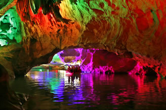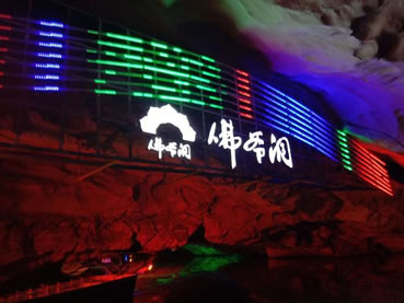 由南天門往右,沿著崎嶇的“盤陀路”進入第二殿,隨著“一柱廳”、“半天山”到達約有450平方米寬的“東海龍宮”那里“定海神針”直立,“五彩神泉池”水色清澈晶瑩,不寒而栗有“白龍越江奪寶”、“頑猴望”、“海獅戲蓮”、“別甲神鷹鎮(zhèn)金沙”、“龍王百寶箱”等天然造型,氣勢磅礴,極為壯觀。龍宮內洞中有洞、景中有景!拔淞陥@”有牛角尖、簸箕天,海螺洞中有“鶴蚌相爭”、“海螺觀戰(zhàn)”、“鳴鑼助戰(zhàn)”、“石床”等石筍、鐘乳石造型,相映成趣,目不暇接。然而,“山有洞天不算奇,陰河劃船數第一”。沿著灣灣曲曲的跳蹬路,耳聽潺水聲,觀看“地海橫鯨”、“青蛙駝蓮”、“天地桃”、“美猴照鏡”等景點來到陰河劃船處——“凱旋門”、只見幽幽碧水,微泛漣漪,各種燈光倒映水中的燈景冉冉浮動。