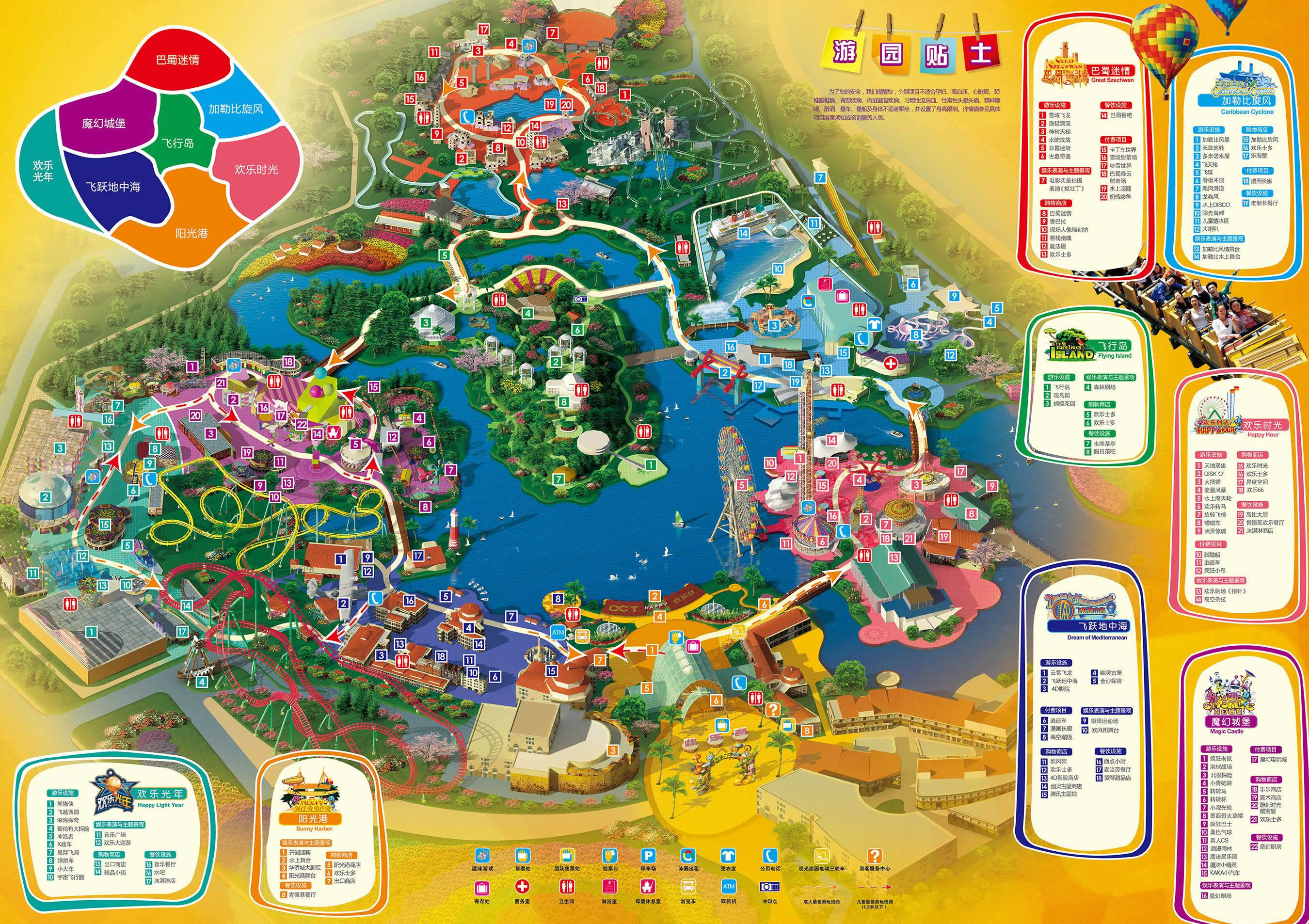 成都?xì)g樂谷占地51萬平方米,由陽光港、歡樂時(shí)光、加勒比旋風(fēng)、巴蜀迷情、飛行島、魔幻城堡、飛躍地中海、歡樂光年及絲路傳奇9大主題區(qū)域組成,擁有百余項(xiàng)景點(diǎn)。其中設(shè)置了159項(xiàng)體驗(yàn)觀賞項(xiàng)目,包括超過54項(xiàng)娛樂設(shè)備設(shè)施、58處人文生態(tài)景觀、27項(xiàng)藝術(shù)表演、20項(xiàng)主題游戲和商業(yè)輔助性項(xiàng)目。