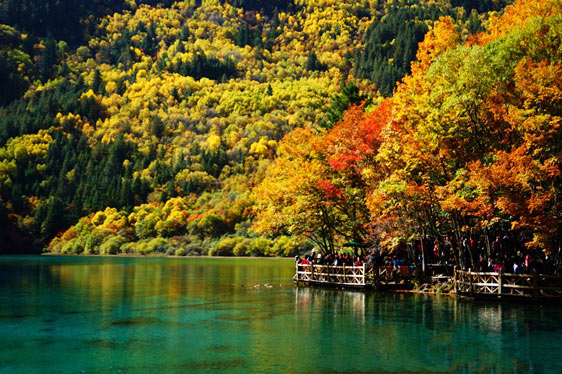 浪漫的秋風(fēng)也吹來(lái)了九寨溝最為燦爛的時(shí)節(jié)。山林暈染成色,除了綠色以外,還呈現(xiàn)出金黃、火紅等色彩,五彩繽紛,倒映在明麗的湖水中,湖山同色,湖水也斑斕似錦了,一時(shí)間竟然不能分清哪里是山哪里是水,十分迷人。
