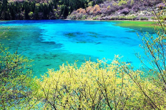 春風(fēng)吹拂,沉睡的九寨溝蘇醒了。冰雪融化,新綠發(fā)芽,春水的顏色映著山色,嬌嫩得讓人不忍探視,仿佛只要輕輕地一口氣都能讓它消失。水邊道旁,鬧哄哄開滿了不知名的美麗山花,桃紅、絳紫、靚藍(lán)、鵝黃,繁華似錦,爛漫一路。溫柔而慵懶的春陽(yáng)吻接湖面,愛(ài)撫春芽,也悸動(dòng)了你久閉的心門......