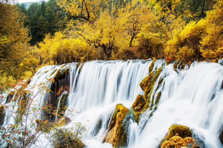 諾日朗瀑布海拔2343米,高24.5米、寬320米,是中國(guó)最寬的高山鈣華瀑布。滔滔流水自諾日朗群海而來(lái),從瀑頂樹叢中傾瀉而下,像數(shù)條潔白的哈達(dá),水勢(shì)浩大,聲震山谷。寒冬時(shí)節(jié),瀑布成了一幅巨大的冰幔,無(wú)數(shù)的冰柱懸掛在陡崖之上,成為罕見(jiàn)的冰晶世界,造型各異的冰雕迎光透著幽幽的藍(lán)色魅惑,是九寨溝六絕之一“藍(lán)冰”。