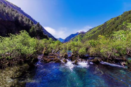 孔雀河道是從五花海出水口深谷里的一條河道。孔雀河道像是走在一副最濃烈的色彩創(chuàng)造出來(lái)的油畫里,又猶如孔雀羽一樣,將塵世間最美麗的藍(lán)和綠都融合在一起。