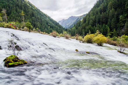 盆景灘海拔2190米,長(zhǎng)218米、寬98米,水深0.8米,是進(jìn)入九寨溝的第一個(gè)灘流景觀。淺灘上,柳、柏、楊、松,杜鵑等植物叢生,綴以花草、石塊,樹干四周因鈣華堆積形成略高于水面的天然盆堤,宛若一組組盆景。