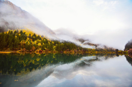鏡海海拔2367米,長(zhǎng)1155米、寬241米、深31米,是九寨溝第三大湖泊,因水面平靜如鏡而得名。