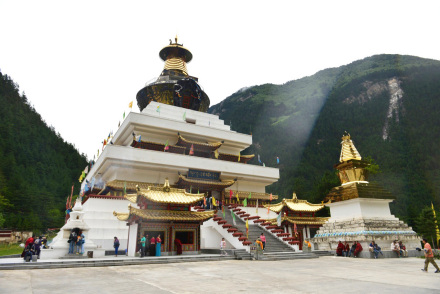 目前,九寨溝景區(qū)僅保留了樹正寨、荷葉寨、則查洼寨這三個(gè)村寨,善良淳樸的他們,用微笑迎接著前來(lái)九寨溝的每一個(gè)人。而在這些村寨中,最壯觀的莫過(guò)于樹正寨前的“九寶蓮花菩提塔”,七彩經(jīng)幡隨風(fēng)飄蕩,圣潔的白塔在陽(yáng)光下仿若閃著光,這里也是眾多游客到來(lái)時(shí),都會(huì)雙手合十,輕聲祭拜的地方。